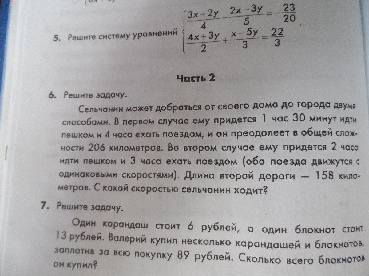 Пусть скорость пешком х км/час, скорость на поезде у км/час.1,5х + 4у = 206 (1)2х + 3у = 158 (2)Умножим 1-е на 3, 2-е на 4:4,5х + 12у = 618 (1)8х + 12у = 632 (2)и вычтем (1) из (2)3,5х = 14х = 4 (км/час) - скорость сельчанина.
