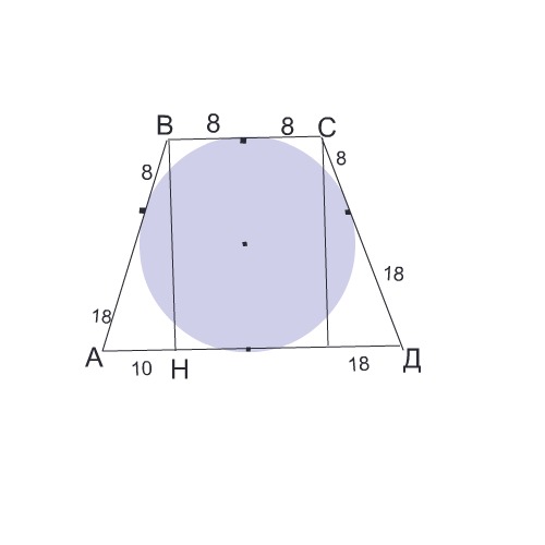 Коло вписане в рівнобічну трапецію, ділить точкою дотику бічну сторону на відрізки завдовжки 8см і 18 см. Знайдіть площу трапеції