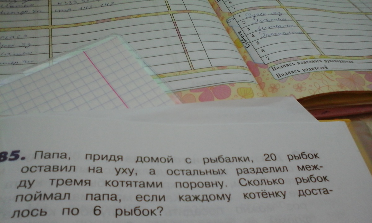 Сколько рыбок поймал папа если каждому котёнку досталось по шесть рыбок