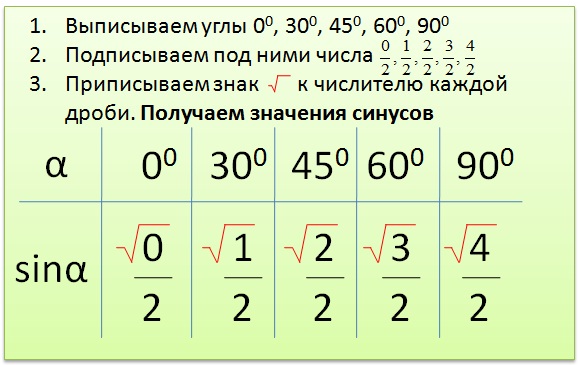 Чтобы получить значения косинусов углов, нужно числа 0/2, 1/2, 2/2, 3/2, 4/2 записать в обратном порядке., т.е. .для угла 0 будет значение синуса угла 90° , для 30°- значение 60° и т.д. ------------------------- Таблица - руководство к тому, как просто и накрепко запомнить синусы и косинусы наиболее часто встречающихся при решении задач углов. Зная синус и косинус угла, уже просто