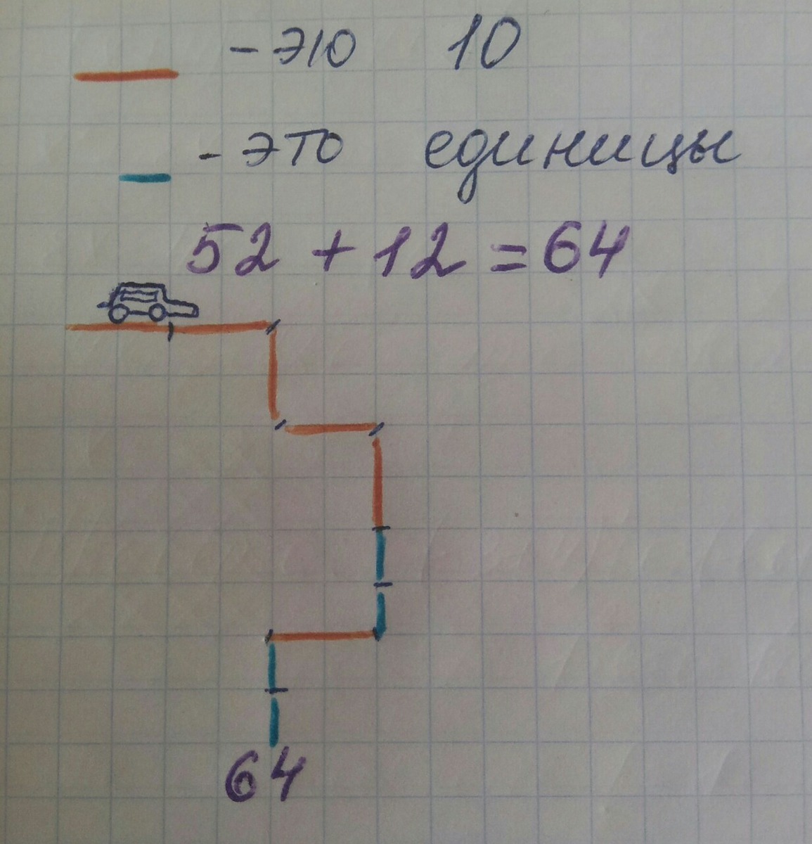 тут надо нарисовать, например 10-это будут кружочки, а единички это треугольники...число 52 = 5 кружков+ 2 треугольника... но вот с машиной, наверно, надо отрезки брать