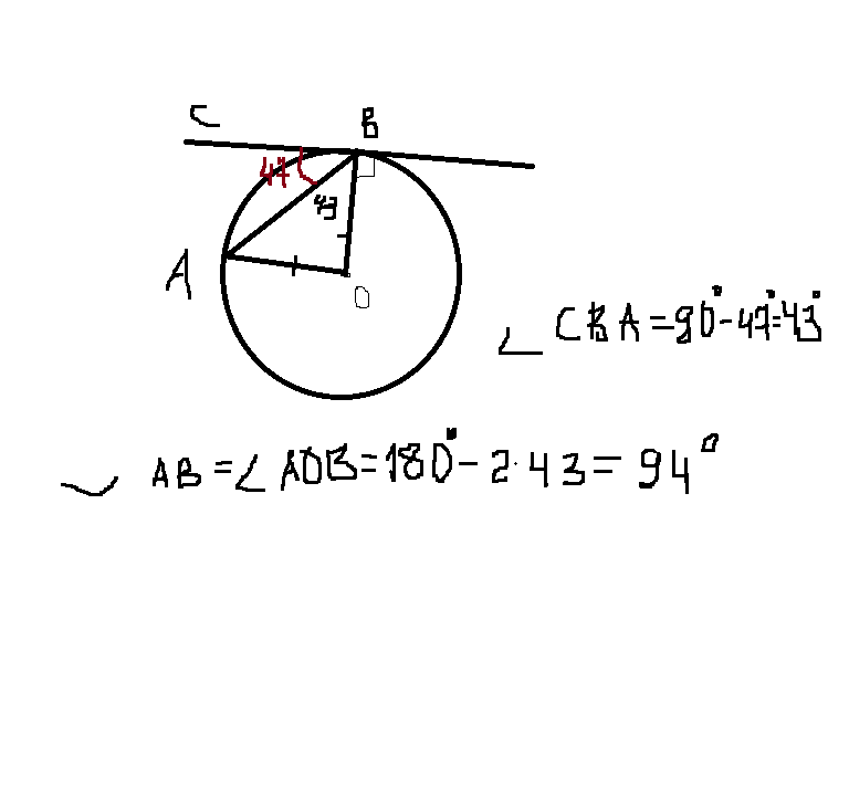 хорда АВ стягивает дугу окружности. найти меньшую дугу АВ, если угол АВС между хордой АВ и касательной к окружности, проведенной через точку В равен 47 градусам. ответ дайте в градусах