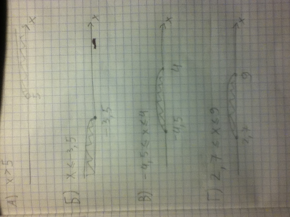 изобразите на координатной плоскости множество решений неравенства, ЕСЛИ Х- ДЕЙСТВИТЕЛЬНОЕ ЧИСЛО: А) Х >5 Б) X ≤ -3,5 В)-4,5 ≤ Х≤4 Г)2,7≤Х≤9
