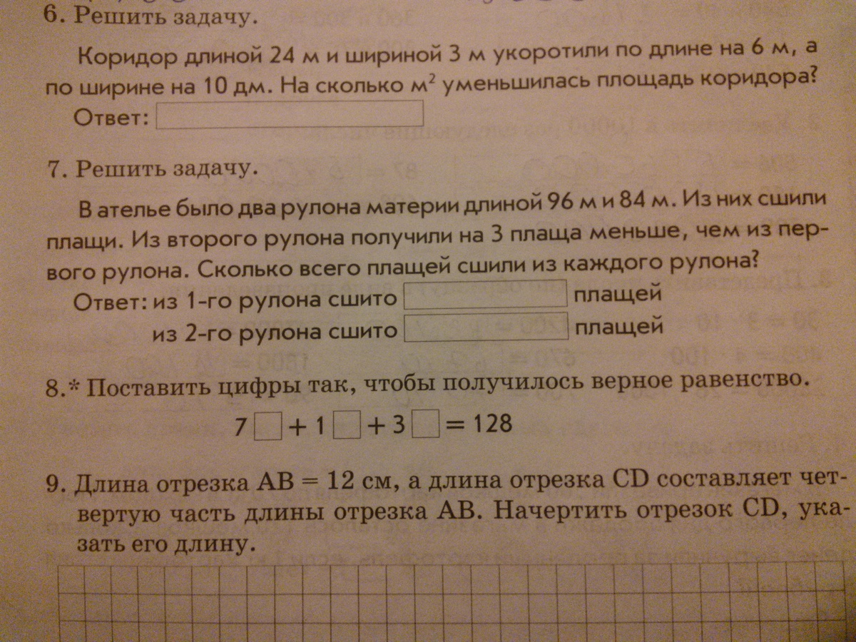 Номер 6 24*3=72 м^2 - площадь сначала18м*2м=36м^2 - площадь после уменьшения72-36=36 м^2Ответ:36м^2