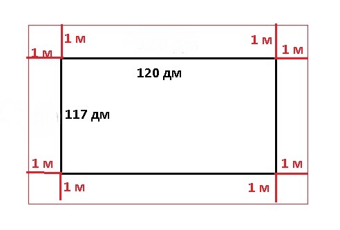 Поскольку сетка находится на расстоянии 1 м от забора, то к каждой стороне прибавляем по 2 м (для наглядности см. рисунок в приложении)