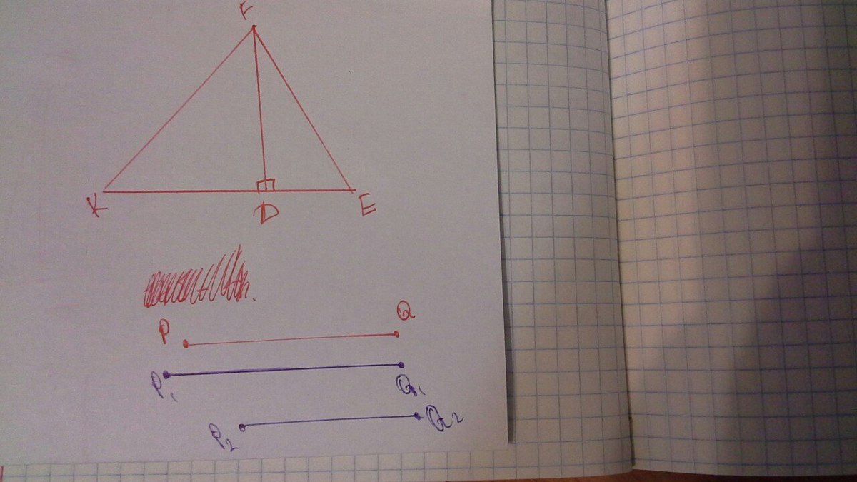 Даны отрезки PQ и P1Q1 и P2Q2. Постройте треугольник ЕKF так, чтобы ЕF = PQ, KF = P1Q1 и FD = P2Q2, где FD – высота треугольника