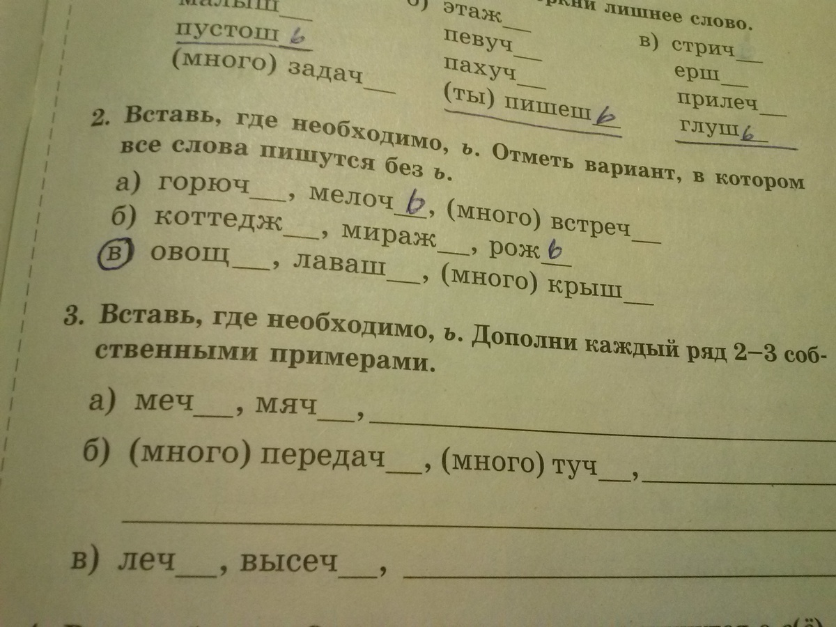 а) меч,мяч,ночь,ложь. б) много передачь,много тучь,много лужь,много грыжь. в) лечь высечь ездишь катаешь