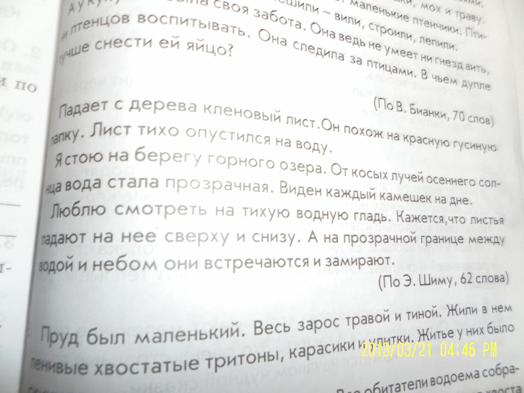 Люблю смотреть на тихую (В.п.) водную (В.п.) гладь (нулевое окончание; В.п.). Кажется, что листья (И.п.) падают на неё сверху и снизу. А на прозрачной (П.п.) границе (П.п.) между водой (Т.п.) и небом (Т.п.) они встречаются и замирают.