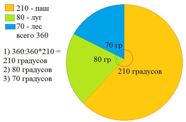 Постройте круговую диаграмму, если известно, что лес занимает 70 га, луг- 80 га, и пашня-210 га.