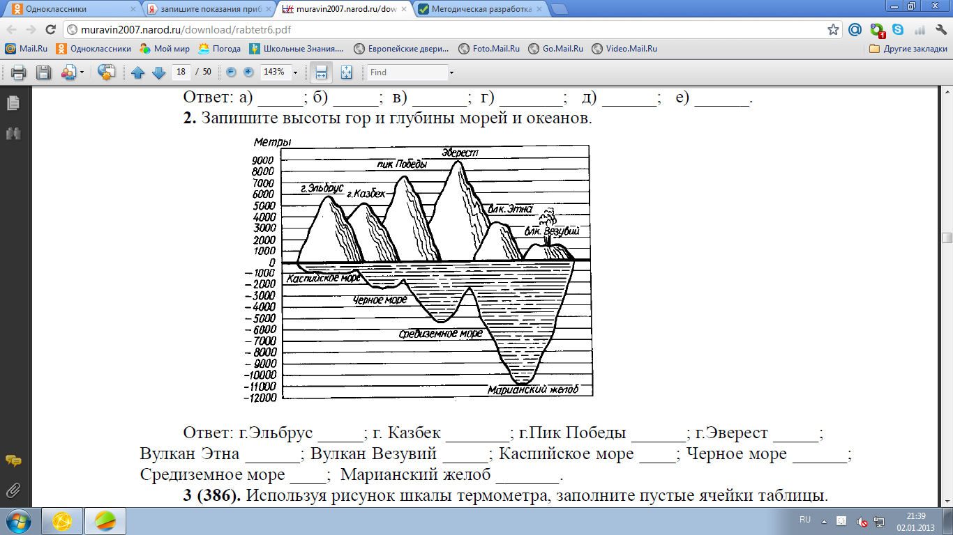 2.Запишите примерное значение высоты гор и глубины морей и океанов: