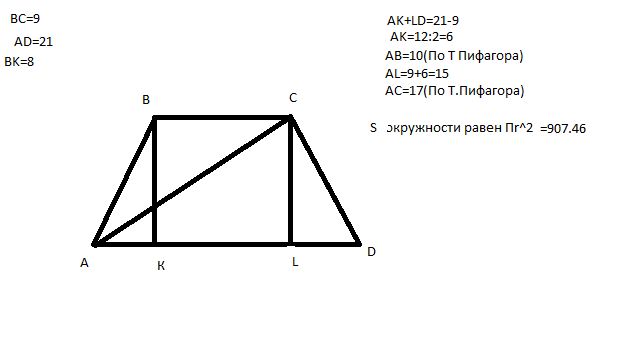 в равнобедренной трапеции основания равны 21 см и 9 см, а её высота равна 8. Найти площадь описанного около этой трапеции круга. ТОКА ПОЖАЛУЙСТА ПЛОЩАДЬ А НЕ РАДИУС. Я ЗНАЮ В ИНТЕРНЕТЕ ЕСТЬ ПОХОЖАЯ ЗАДАЧА ТОКА ТАМ РАДИУС НУЖНО НАЙТИ, А ЗДЕСЬ ПЛОЩАДЬ, ПЛОЩАДЬ, ПЛОЩАДЬ КРУГА.
