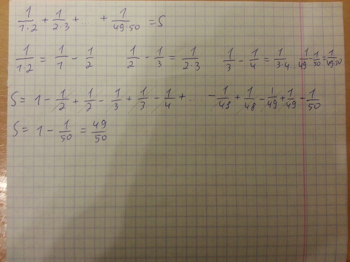 Используя наиболее удобный способ вычислений , найдите значение выражения: 1/1*2+1/2*3+1/3*4+...1/49*50