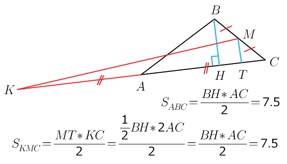 Точка M-середина стороны BC треугольника ABC, а вершина A-середина отрезка CK. Найдите площадь треугольника CKM, если площадь треугольника ABC равна 7,5.