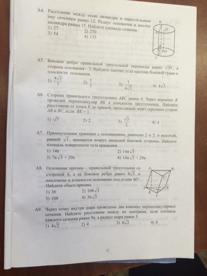 А7) Тело вращения - усечённый конус. Площадь его поверхности равна сумме площадей оснований и боковой поверхности. Для последней надо найти образующую конуса: L = V(3+9) = V12 = 2V3. тогда Sбок = пи*(2+5)*2V3 = 14пиV3. Полная площадь равна S = пи*2:2+пи*5^2+14пиV3 = 29пи+14пиV3. Это ответ 4.