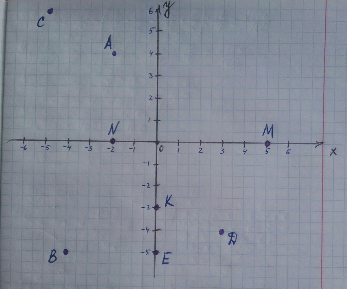 отметьте на координатной плоскости точки А (-2; 4) В (-4; -5) С (-5; 6) Д (3; -4) Е (0; -5) К (0; -3) N (-2; 0) M (5; 0)