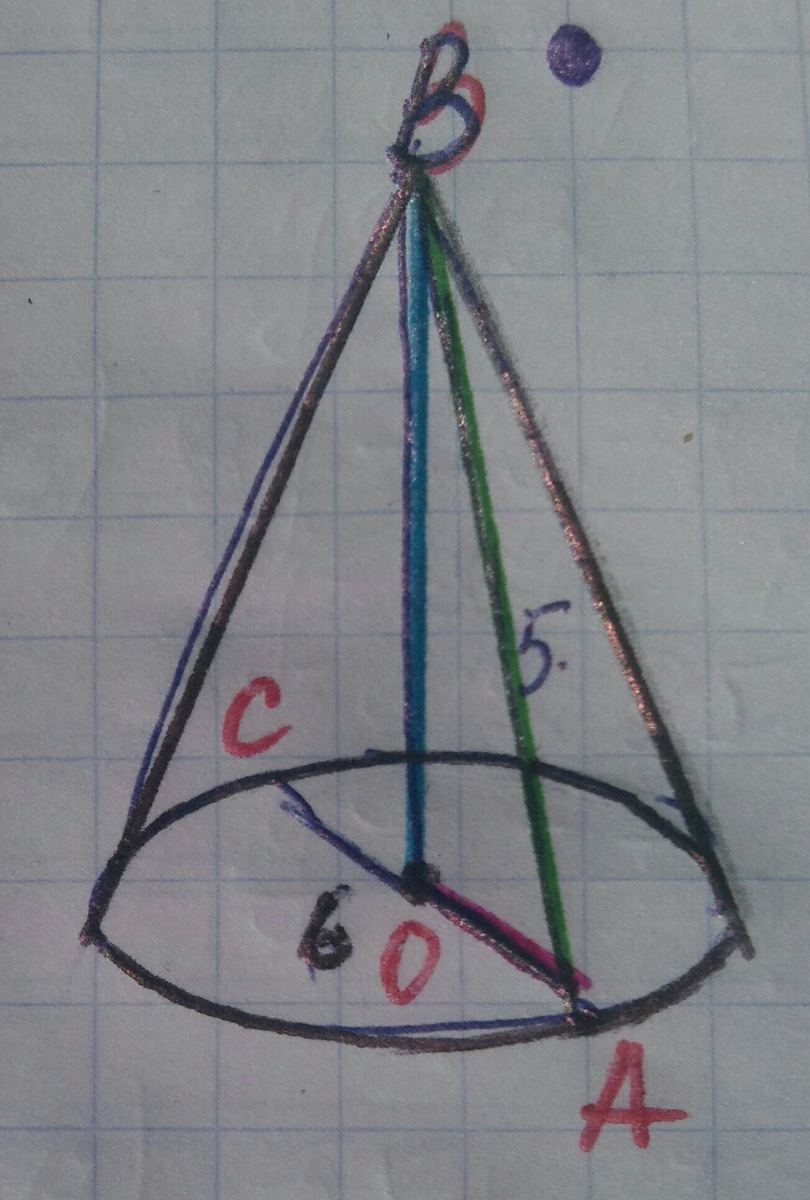 Опустимо висоту на основу конуса (ВО). Точка О -це центр основи конуса, який ділить діаметр навпіл. Тому,