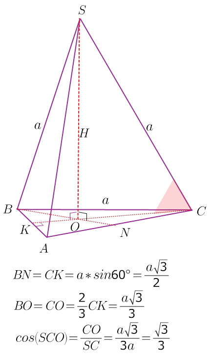 Найдите косинус угла между боковым ребром и плоскостью основания пирамиды,если все ребра пирамиды равны,а пирамида треугольная.