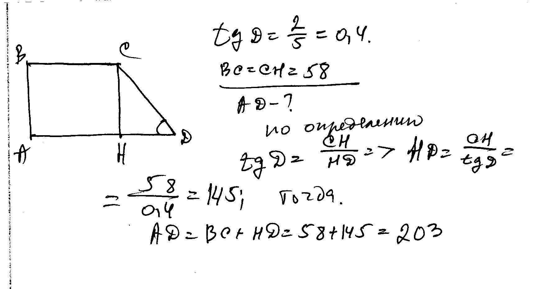 тангенс острого угла прямоугольной трапеции равен 2/5.Найдите её большее основание если меньшее равно высоте и равно 58