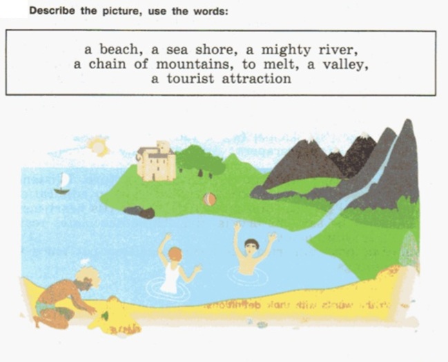 a beach, a sea shore, a mighty river, a chain of mountains, to melt, a valley, a tourist attraction.