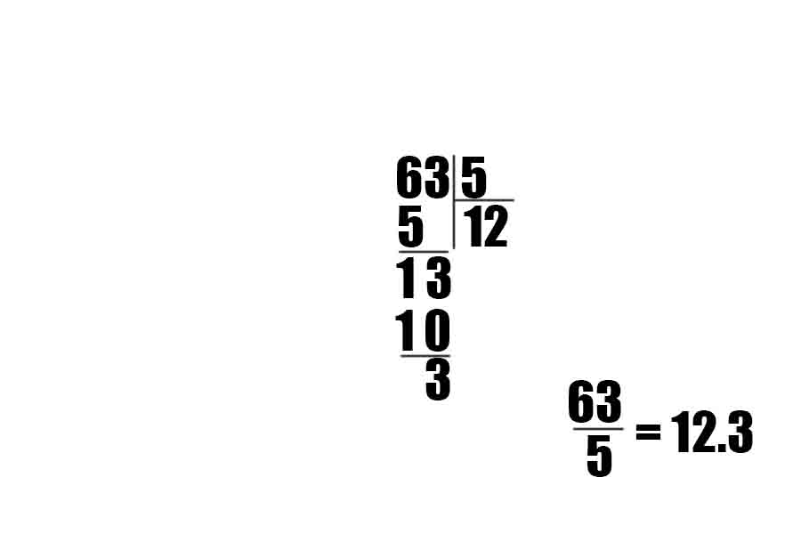 63:5 берём 1, 6-5=1, делим дальше 13:5 берём 2, 13-10=3.... ну а дальше как я писал, 3*10=30 30:5=6 в итоге 12,6