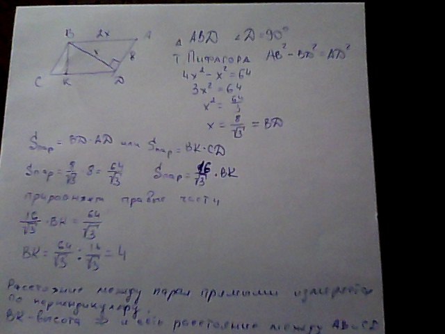 диагональ BD параллелограмма ABCD перпендикулярна стороне AD и равна половине стороны AB найти расстояние между прямыми AB и CD если AD=8