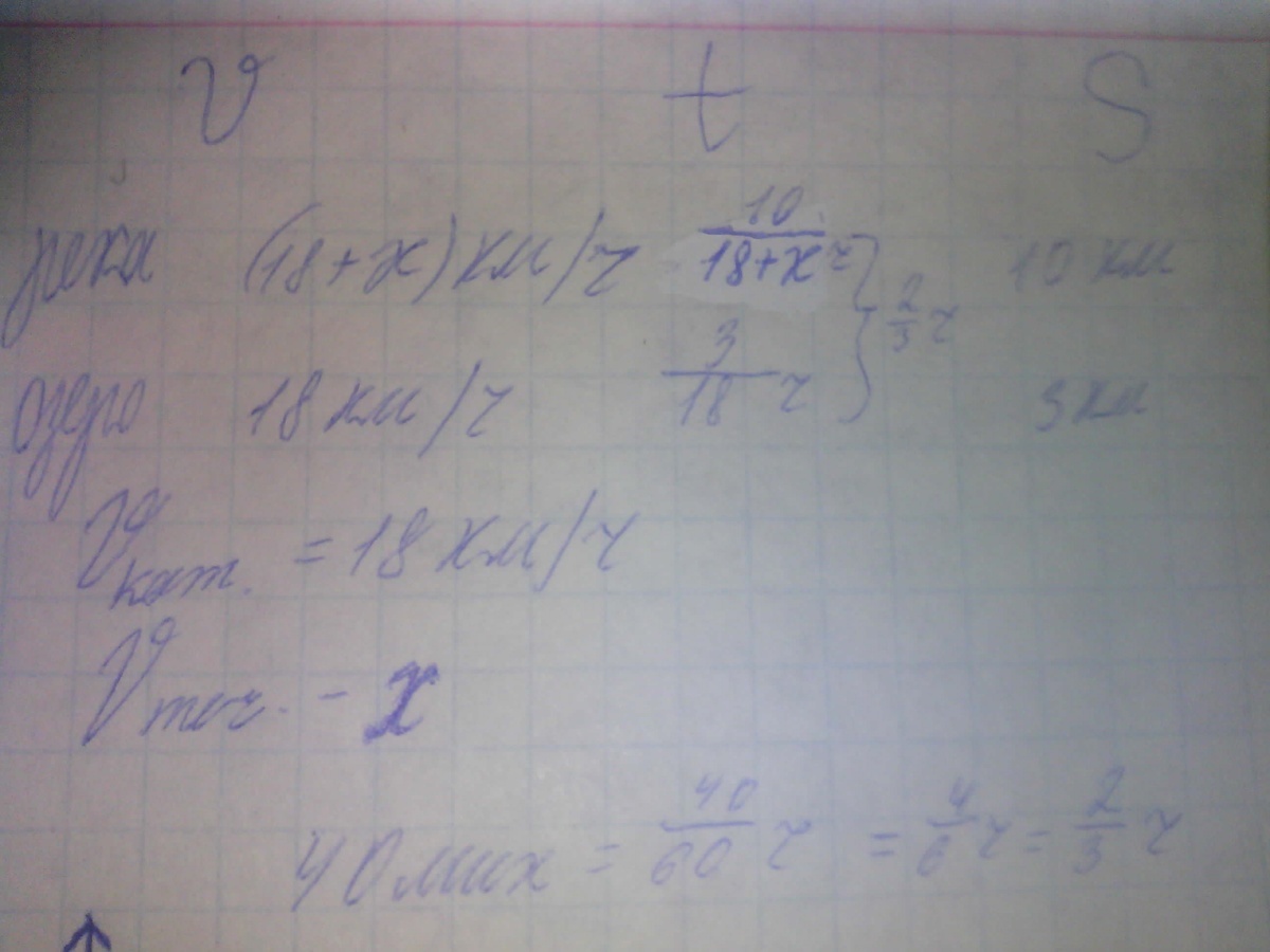 катер проплыл сначала 10 км по течению реки а затем 3 км по озеру в отстутствии течения. Найдите скорость течения реки если собственная скорость катера была постоянна и равна 18 км/ч а время затраченое катером на весь путь составило 40 минут