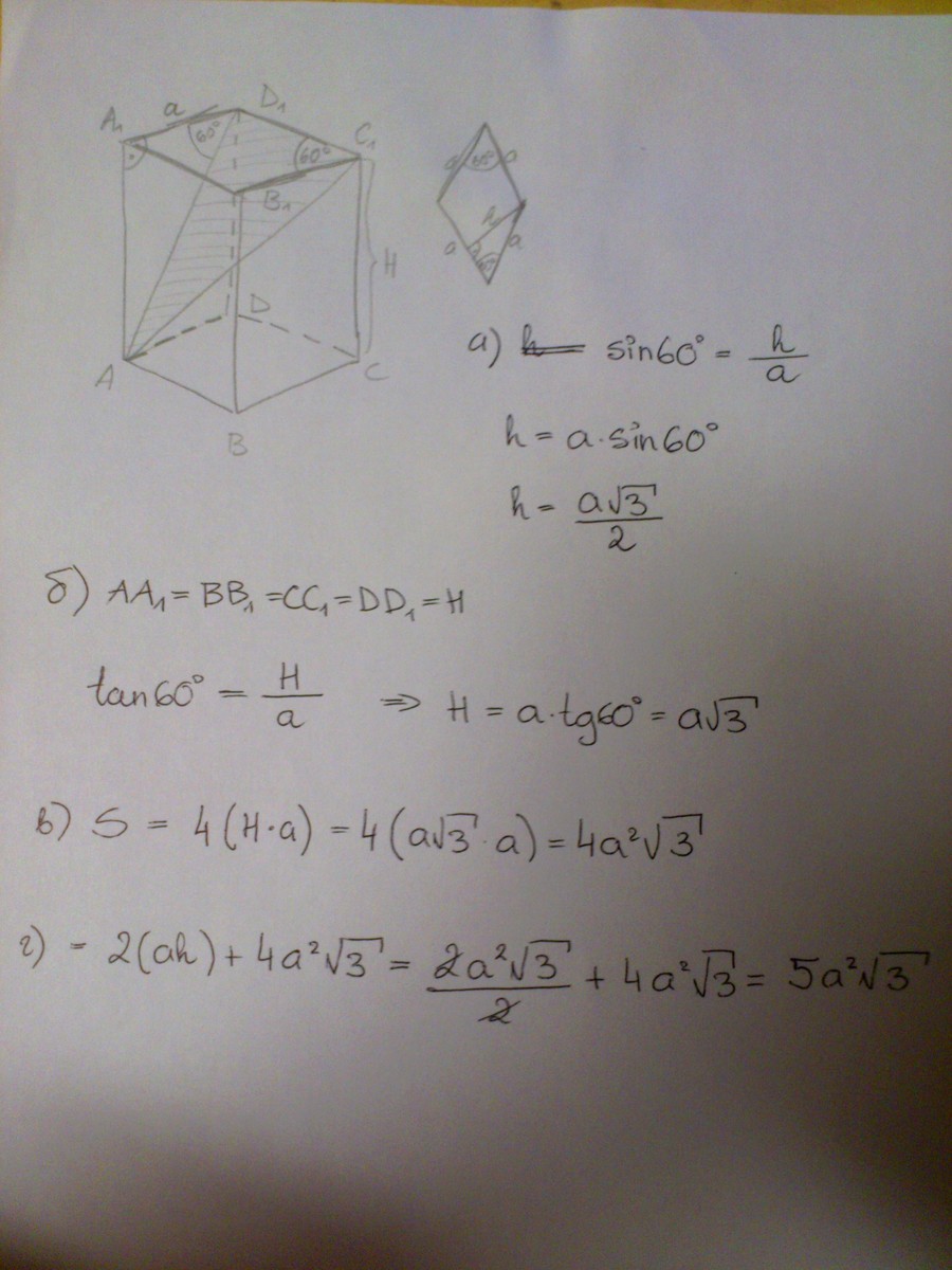 Основанием прямого параллелепипеда ABCDA1B1C1D1 является ромб ADCD, сторона которого равна а и угол равен 60 градусов. Плоскость AD1C1 составляет с плоскостью основания угол в 60 градусов. Найдите: