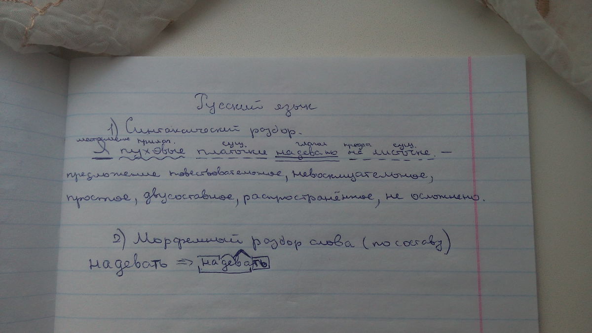 Я пуховые платочки надеваю на листочке.⁴(синтаксический разбор предложения)