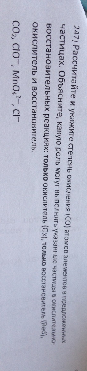 Кислород имеет степень окисления-2. С+4О2 углерод может только принимать электроны, поэтому может быть только (ох).Сl+5О3- может как принимать электроны так и отдавать, т.е.(ox) (Red),Mn+6O4-2(ox).(Red),Cl-(Red)