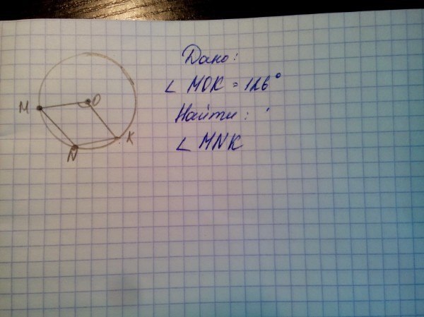 угол МОК=126, он центральный, значит дуга MNK=126 градусам. Тогда дуга МК= 360-126= 234градуса. А угол MNK вписанный и он равен 117 градусам, т.к. вписанный угол равен половине дуги на которую он опирается.