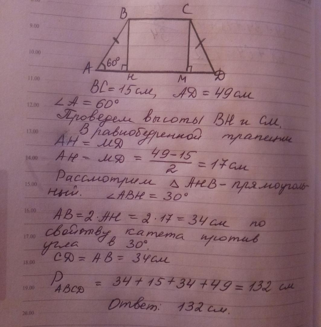 Ровнобедренная трапеция ABCD. Дано: AD нижнее основание, BC верхнее основание, угол А=60 градусов, BC=15см, AD=49см. Найти периметр. Решите пожалуйста, заранее спасибо!