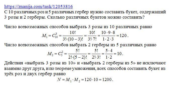 С 10 различных роз и 5 различных гербер нужно составить букет, содержащий 3 розы и 2 герберы. Сколько различных букетов можно составить?