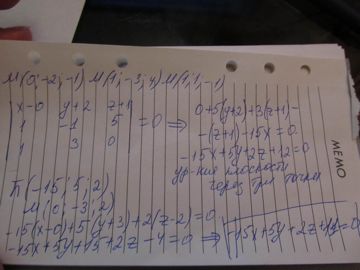 составить уравнение плоскости проходящей через точку М(0;-3;2) параллельно плоскости, проходящей через три точки М1(0;-2;-1), М2(1;-3;4), М3(1;1;-1)