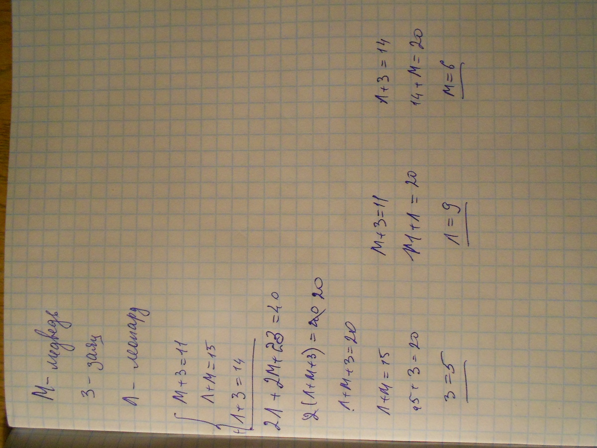 Талисманы олимпийских игр в Сочи 2014 году - Зайка, Белый Мишка, Лоепард - после изнурительных тренировок сели пить чай. Белый Мишка и Зайка выпили вдвоем 11чашек, Леопард и Белый Мишка - 15, а Зайка и Леопард - 14. Сколько чашек чая выпили все Зайка, Белый Мишка и Леопард вместе????