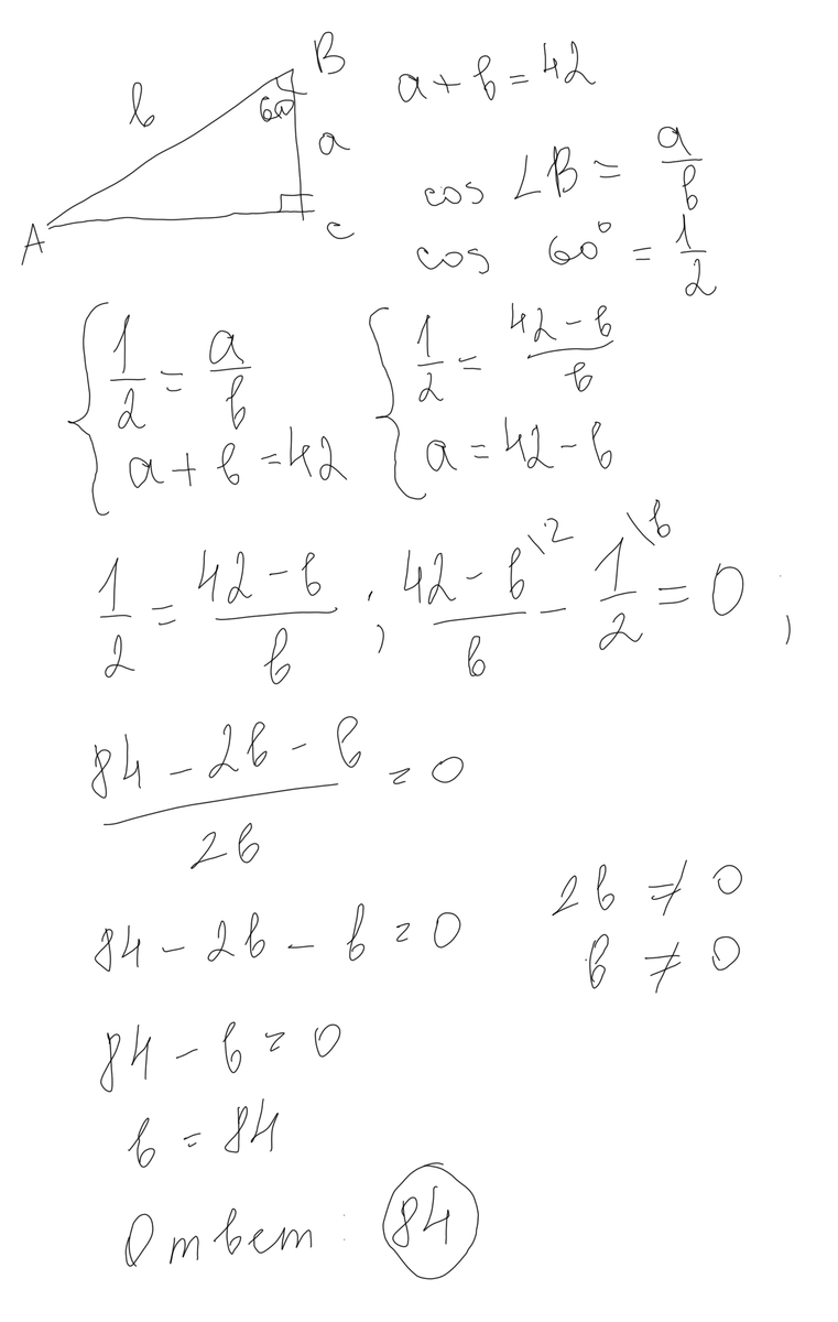 Один из углов прямоугольного треугольника равен 60 градусов,а сумма гипотенузы и меньшего катета равна 42 см. Найдите гипотенузу.