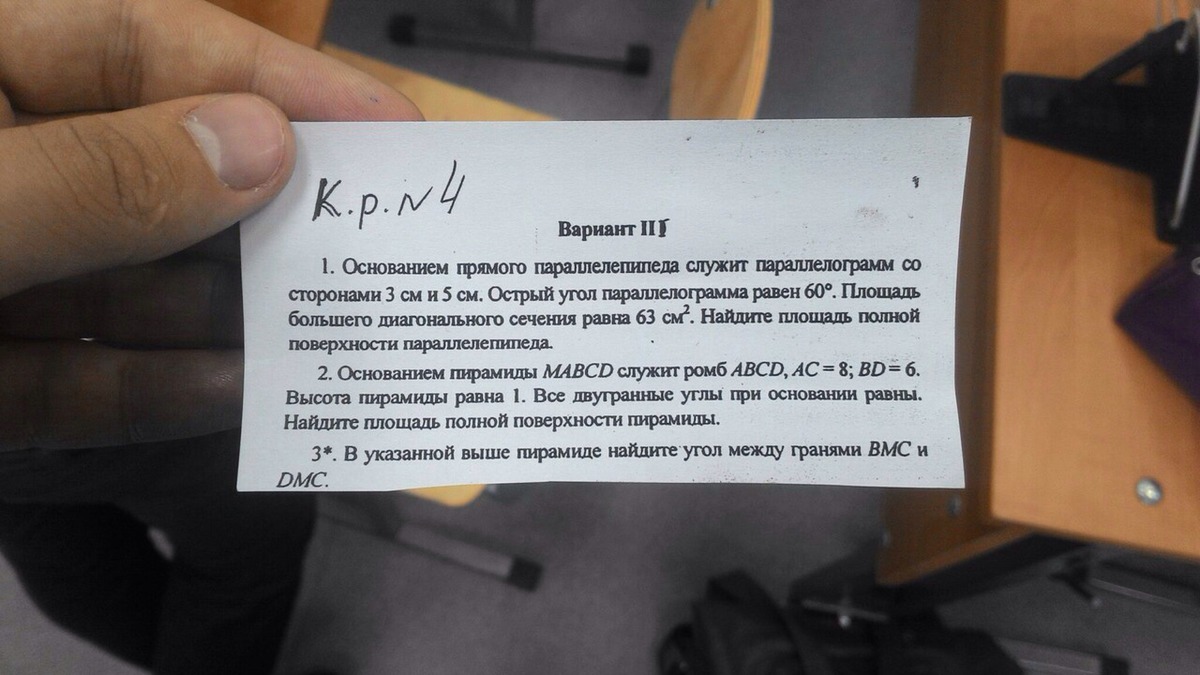 1 задание:начнем с основания:дана площадь большего диагонального сечения равная 63 см.найдем большую диагональ основания по теореме косинусов:d1² = 3²+ 5² - 2* 3* 5 * cos(120) = 9 + 25 + 15 =49d1 = 7Sдиаг.сеч = d1 * h7h = 63, h = 9найдем площадь основания по формуле:Sосн = ab*sina , где а и b стороны параллелограмма, sina угол между нимиSосн = 3 * 5 * √3/2 = 15√3/2теперь найдем S одной боковой грани, так как фигура прямая , то противоположные грани будут равны:S1бок = 3 * 9 = 27S2бок = 5*9 = 45Sполн = 2Sосн + Sбок2Sосн = 15√3Sбок = 2S1бок + 2S2бок = 2*27 + 2*45 = 144 см²S полн = 144 + 15√3
