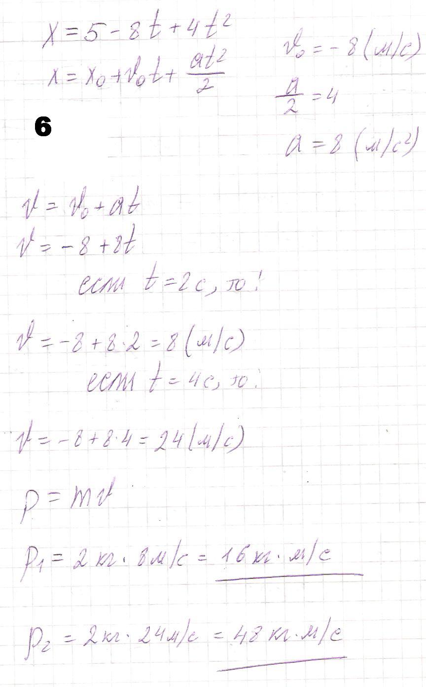 Движение материальной точки описывается уравнением х=5-8t+4t2 . Приняв её массу равной 2 кг, найти импульс через 2 с и 4 с после начала отсчёта времени.