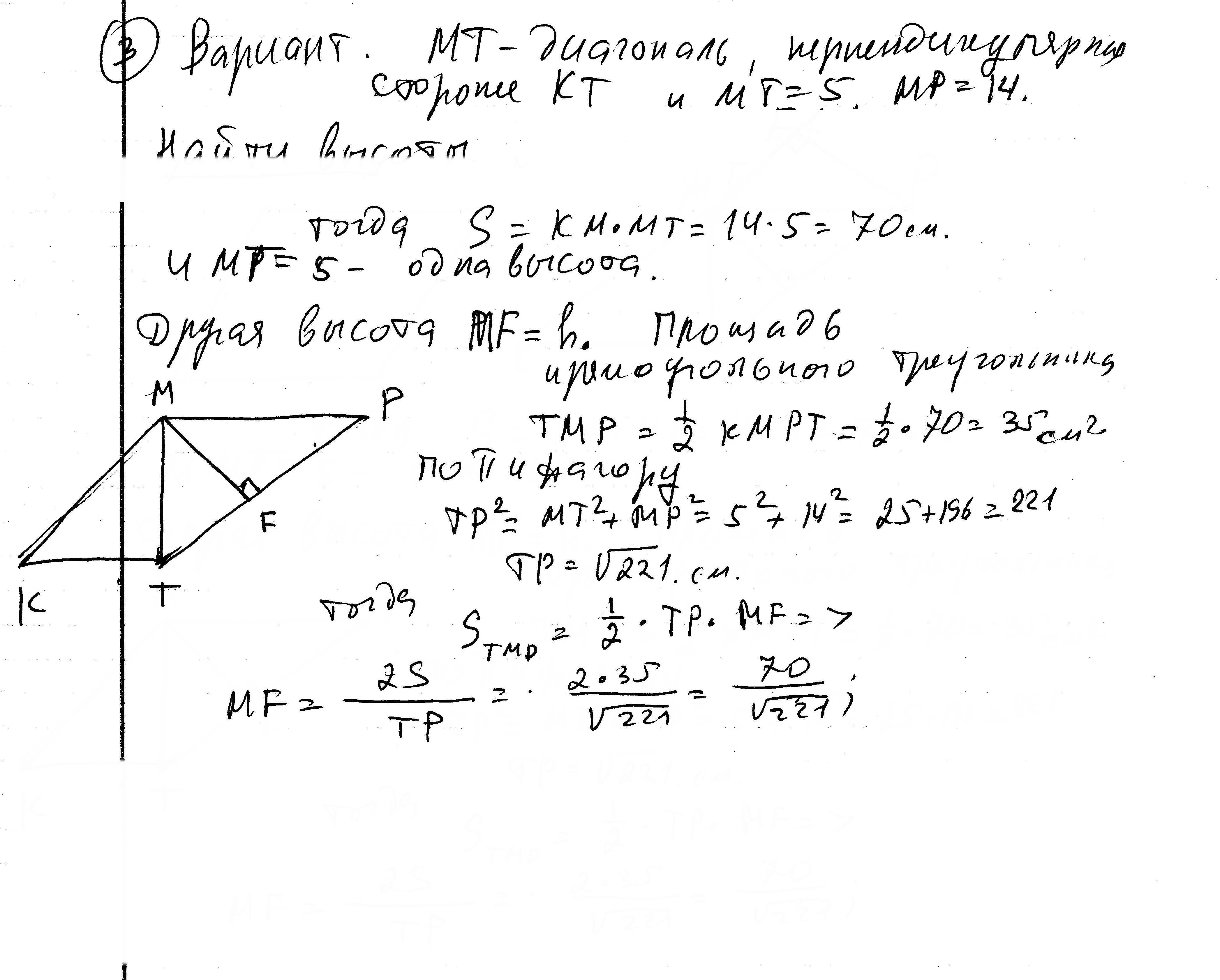 В параллелограмме КМРТ диагональ МТ перпендикулярна стороне МК. КМ=13см,МТ=5см. Найти S параллелограмма и его высоты, если МР=14 см.