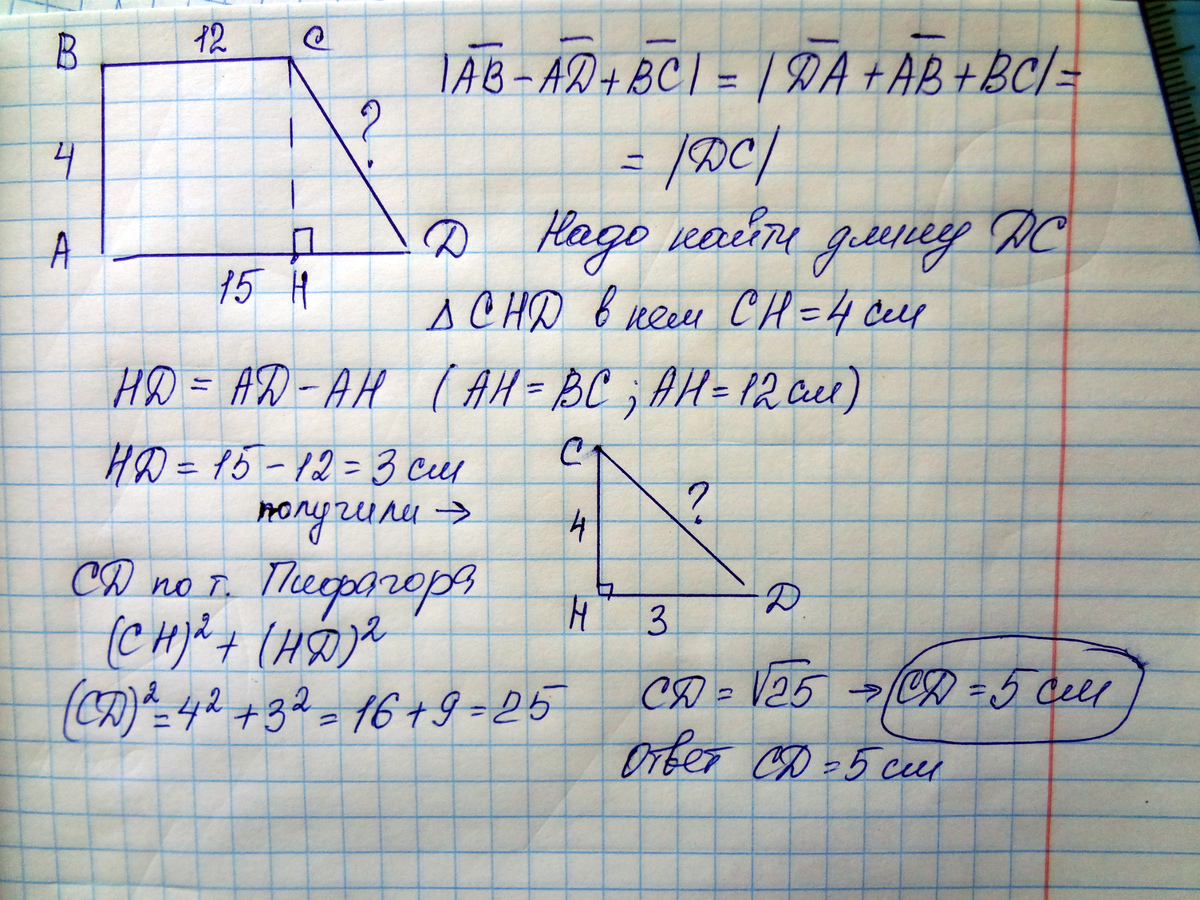 В прямоугольной трапеции ABCD(угол A=90°) известно, что AB=4см, AD=15 см, BC=12см. Найдите величину |вектор AB- вектор AD+ вектор BC|.