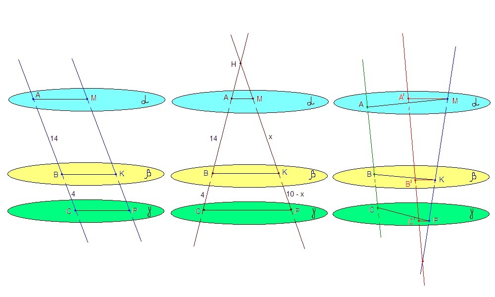 Прямая АВ пересекает параллельные плоскости α, β,γ соответственно в точках А, В, С, причем АВ = 14, ВС = 4. Прямая МK пересекает эти же плоскости α, β,γ соответственно в точках М, K, Р, причем МР = 10. Найдите все значения, которые может принимать длина отрезка МK.