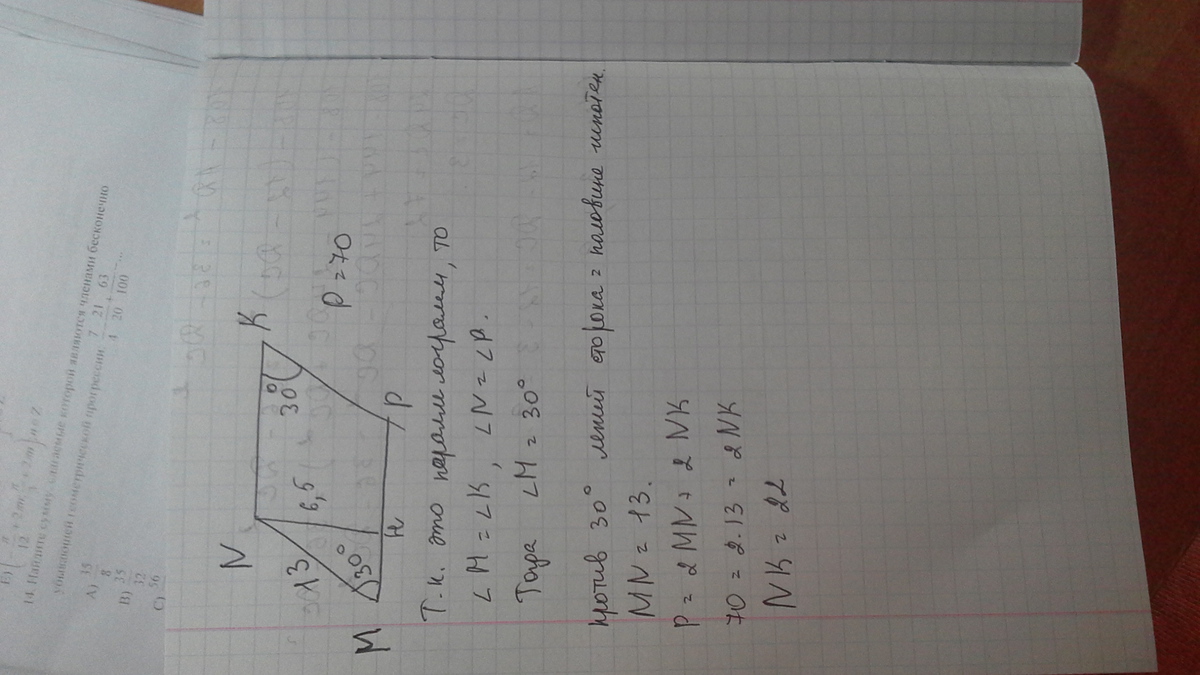 периметр параллелограмма MNKP=70 см. угол K=30°, а перпендикуляр NH=6,5 см. найдите стороны параллелогррамма.