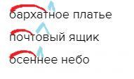 ЗАПИШИ СЛОВОСОЧЕТАНИЯ ЗАМЕНЯЯ ВЫДЕЛЕННЫЕ СЛОВА ИМЕНАМИ ПРИЛАГАТЕЛЬНЫХ ОБОЗНАЧЬ КОРНИ И СУФФИКСЫ ПРИЛАГАТЕЛЬНЫХ платье из бархата , ящик для почты ,небо осенью