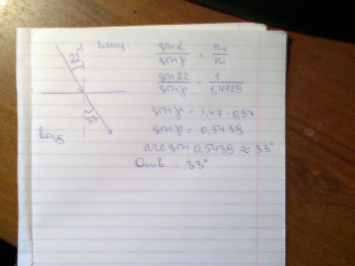 n = sin α / sin β, sin β = sin α / n, sin β = sin 22* / 1.4729 = 0.2543, β = 14.7*