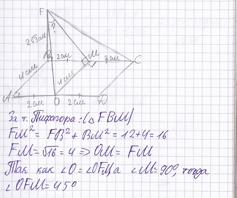 Через вершину квадрата ABCD проведён перпендикуляр BF к его плоскости. Вычислительной градусную меру угла наклона прямой OF(точка 0 середина отрезка AD) к плоскости FBC,еслиAB=4 см,BF=2√3см.