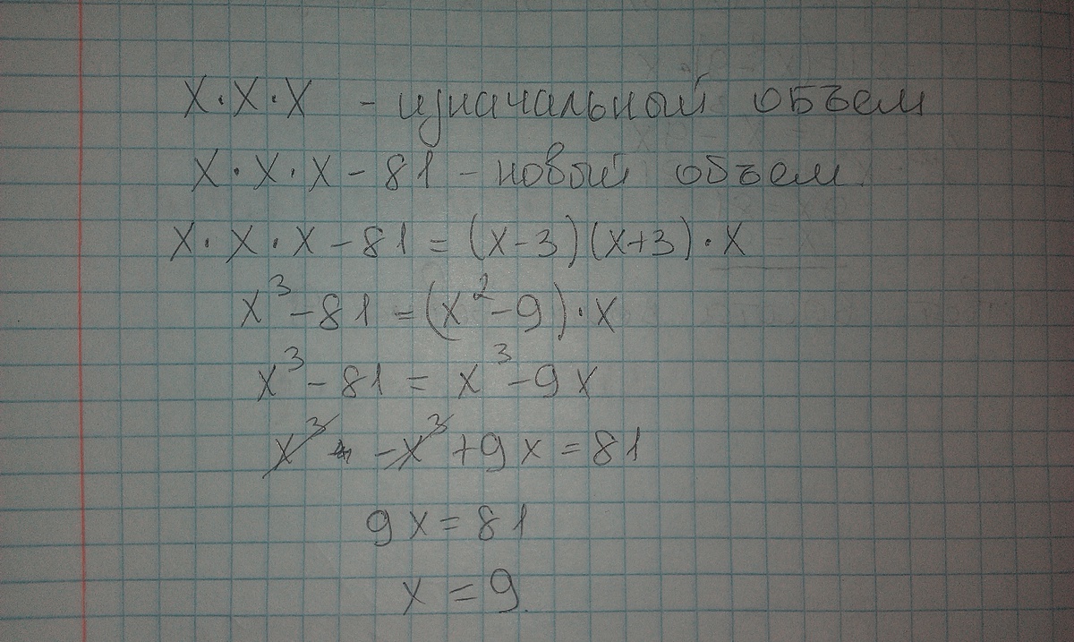 "при этом обьем дома уменьшился на 81 метр^3" - старый объем дома находится как x*x*x. Т.к. новый объем на 81 меньше, то он равен старый объем минус 81, то есть x*x*x-81. Также новый объем дома равен новая ширина умножить на новую длину умножить на новую высоту: (x-3)*(x+3)*x. Далее приравниваем два новых объема, и получается уравнение. При решении уравнения все что с х переносится влево, все, что без х, - вправо.