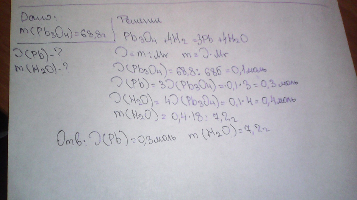 какое кол-во свинца восстановилось из оксида свинца Pb3O4 массой 68,8г и сколька (г0 воды при этом образовалось? Pb3O4+h2=Pb+H2O