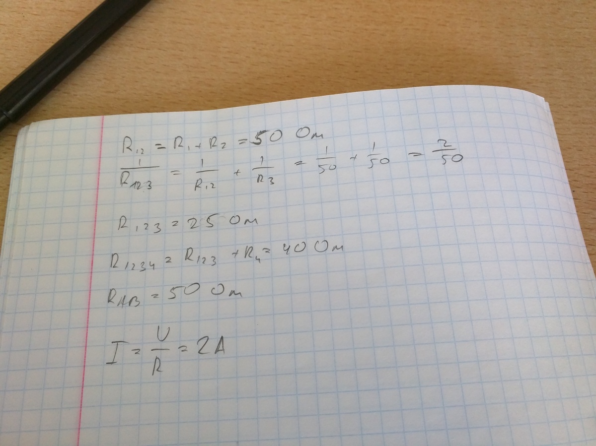 т.к. сопротвиления параллельных ветвей равны, токи будут делится поровну I1=I3=1A