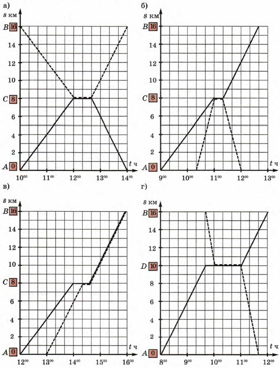 Рассмотри графики движения и определи по ним скорости движущихся объектов, время начала и конца движения, время и место их встречи, продолжительность остановок. Придумай события, отражением которых могли бы служить данные графики.