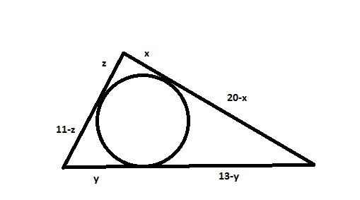 20-x=13-11+x; x=18/2=9=z; y=11-9=2, т.е. стороны поделены соответственно
