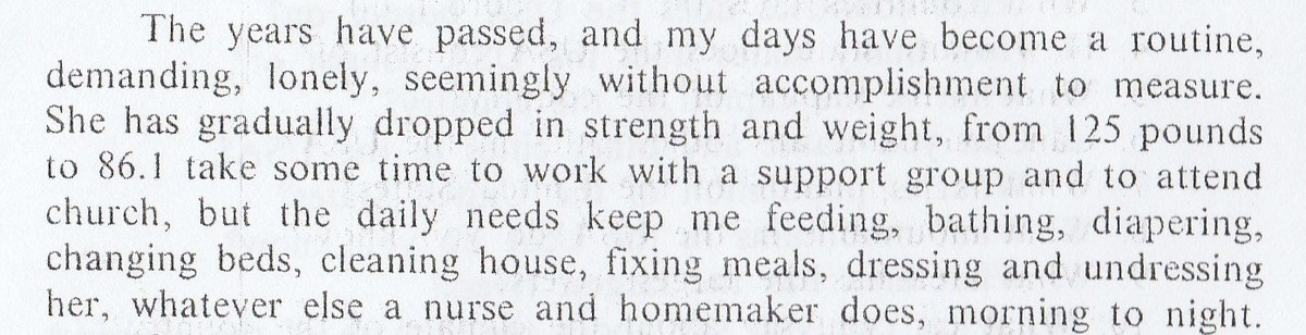 Года пролетели, и мои дни стали обычными, требующими, одинокими, кажется, бесконечными. Она постепенно теряет силу и вес, с 125 фунтов к 86. Мне нужно некоторое время, чтобы работать с поддержкой группы и посещать церковь, но ежедневные нужды содержат кормление, принятие ванны, пеленание, перестилание кроватей, чистка дома, приготовление еды, одевание и раздевание её, и что ещё няня и домработница делает, с утра до ночи.